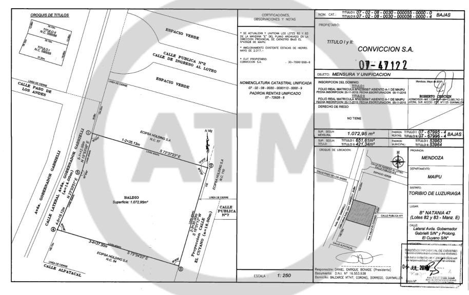 El terreno consta de una superficie de 1.072,95 m2 con un frente de 30,12m. a Lateral de Calle Gobernador Gabrielli, al costado de B° Natania 47, Orientación Oeste.